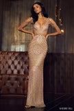 Beaded gown with draped bead shoulders, deep V-neckline and side cut out.