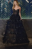 Tulle sequin A-Line ballgown with sheer corset bodice and ruffle skirt.