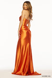 Strapless silky stretched satin gown with corset top, ruched waistline, and skirt slit.