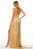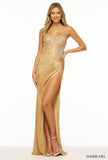 Strapless beaded gown with star embellishments and a high slit.