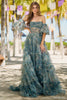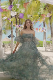 Floral A-line gown with corset bodice, detachable sleeves and ruffle embellishments.