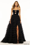 Strapless ballgown with a ruffle skirt and slit, and a velvet bodice embellished with bows, rhinestone details, and cut-outs.