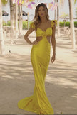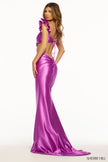 Silky stretched satin fitted gown with side cut outs, rosette embellishment, and ruffled straps.