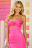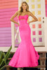 Strapless fitted taffeta mermaid gown with ruched neckline and key hole bodice.