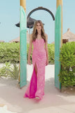 Strapless fitted beaded lace gown with corset bodice and a high slit skirt.
