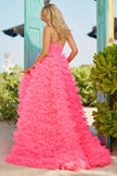 Strapless ball gown with key holes, rosette embellishments, and a tulle ruffle skirt with slit.