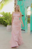 Stretch satin fitted gown with lace up back and chiffon ruffle over skirt.