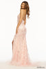 Halter sequin leaf lace embroidered gown with deep V neckline and high skirt slit.