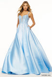 Mikado ball gown with hot fix and deep V illusion and crochet style lace up back.