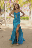Strapless corset fitted gown with keyhole, ruched skirt, and high slit.