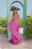 Strapless gown with leaf lace corset top, chiffon ruffle skirt with slit, and lace up back.