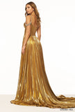 Metallic A-Line gown with key hole bodice, beaded off the shoulder straps, pleated skirt and a high slit.