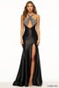 Halter fitted gown with hot fix bodice, keyhole, skirt slit and open back.