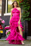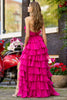 Halter satin corset gown with key hole and an organza ruffle skirt with slit.