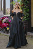 Strapless mikado ball A-line with corset bodice, detachable sleeves, and skirt slit.