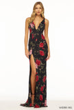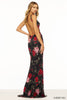 Fitted floral sequins gown with deep V neckline, open back, and high slit.