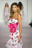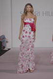Beaded floral gown with ruffle embellished skirt and bow on bodice.