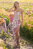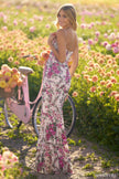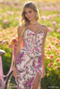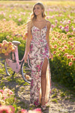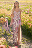 Sequin beaded floral corset gown with deep V illusion gown and high skirt slit.