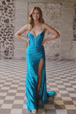 Fitted silky stretched satin gown with rhinestone embellished deep V neckline, and a ruched skirt with slit.