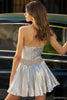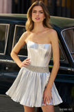 Strapless metallic cocktail dress with bead embellished belt, and pleaded skirt.