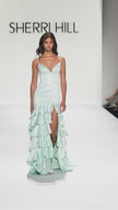 Hot fix gown with ruffle skirt, sweetheart neckline, lace up back, and a skirt slit.