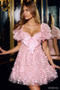 3D flower baby doll cocktail dress with a bow and ballon sleeves.