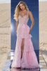 Sequin gown with corset bodice, side ruffle over skirt and high slit.