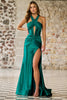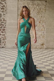 Halter silky stretched satin gown with corset bodice, keyhole, and a high skirt slit.