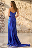 Strapless fitted hot fix gown with corset bodice, and a high skirt slit.