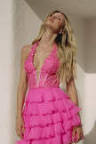 Halter leaf lace cocktail dress with chiffon ruffle skirt.