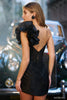 One shoulder fitted hot fix cocktail dress with rosette embellished sleeve and ruched skirt with slit.