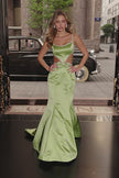 Satin mermaid gown with cut outs, bow and bead embellishments, and an open back.