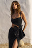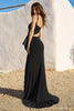 Fitted hot fix gown with side cut out, skirt slit and big bow.