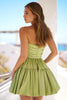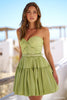 Strapless taffeta cocktail dress with belt and ruffle skirt.