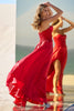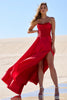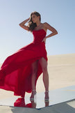 Strapless A-Line gown with lace bodice and skirt slit.