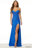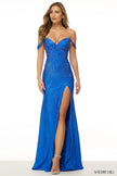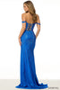 Fitted hot fix off-the-shoulder gown, with lace up back and skirt slit.