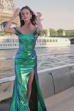 Metallic fitted gown with corset bodice, off the shoulder straps, and skirt slit.