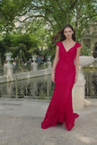 Fitted lace gown with hot stones, and ruffle embellished bodice.