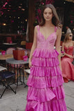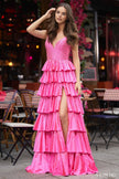 Hot fix ruffle gown with corset bodice, a lace up back, and a skirt slit.