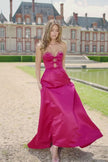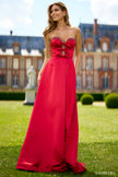 Strapless satin A-line dress with bead and bow embellishments.