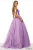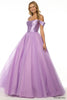 Off the shoulder ballgown with sparkle tulle skirt and a corset bodice.