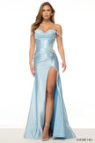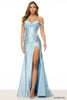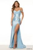 Off the shoulder fitted gown with corset bodice, flower embellishment, and skirt slit.