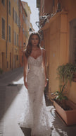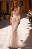 Sequin lace fitted gown with sweetheart neckline and taffeta bow on waist.