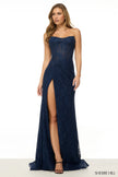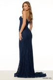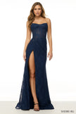 Strapless fitted lace gown with corset bodice and a skirt slit.