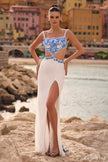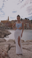 Beaded floral blue print gown with side cut out, open back and skirt slit.