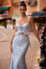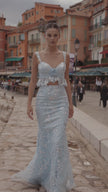 Sequin lace two- piece gown with ruffle trim on bodice.
