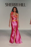 One shoulder stretch satin gown with side cuts and a skirt slit.