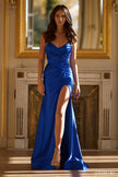 Fitted stretch satin gown with ruching on bodice and high slit.