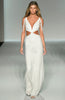 Fitted pearl gown with side cut out and drape shoulders.