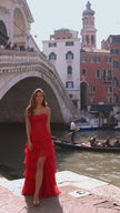 Strapless gown with leaf lace corset bodice and chiffon ruffle skirt with slit.